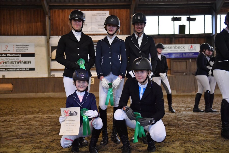Am Sonntag ging unsere Mannschaft beim 50. Elfi Turnier in Lengerich an den Start. Im Reiterwettbewerb legten unsere Reiter einen guten Start hin. Lara Neemeshkana belegte mit Invictus den 4. Platz, Lisa Tebbe und Velvet Boy konnten sich auf dem 7. Platz platzieren. Nach einer harmonischen Runde in der E-Dressur rangierte sich Greta Nähring mit Dancing Diva auf Platz 6. Maya Unger und Cosmopolitan hatten in der Dressur das Glück nicht ganz auf Ihrer Seite und ging ohne eine Schleife aus der Prüfung. Dafür überzeugten sie im E-Springen auf ganzer Linie. Erst gewannen sie das Stilspringen für die Mannschaftswertung mit einer 8,0. In der anschließenden Springprüfung mit Stechen der besten 4 des Stilspringen konnte Maya ebenfalls die Siegerschleife mit nach Hause nehmen und darf sich nun beste Springreiter in im Tecklenburger Land nennen. Unsere zweite Springreiterin Leni Thiemann und Gisele Blümchen hatten leider das Glück nicht auf Ihrer Seite und konnte uns keine zweite Schleife im Stilspringen bescheren. Im Gesamtergebnis würde es ein toller 6. Platz für unsere Mannschaft.
